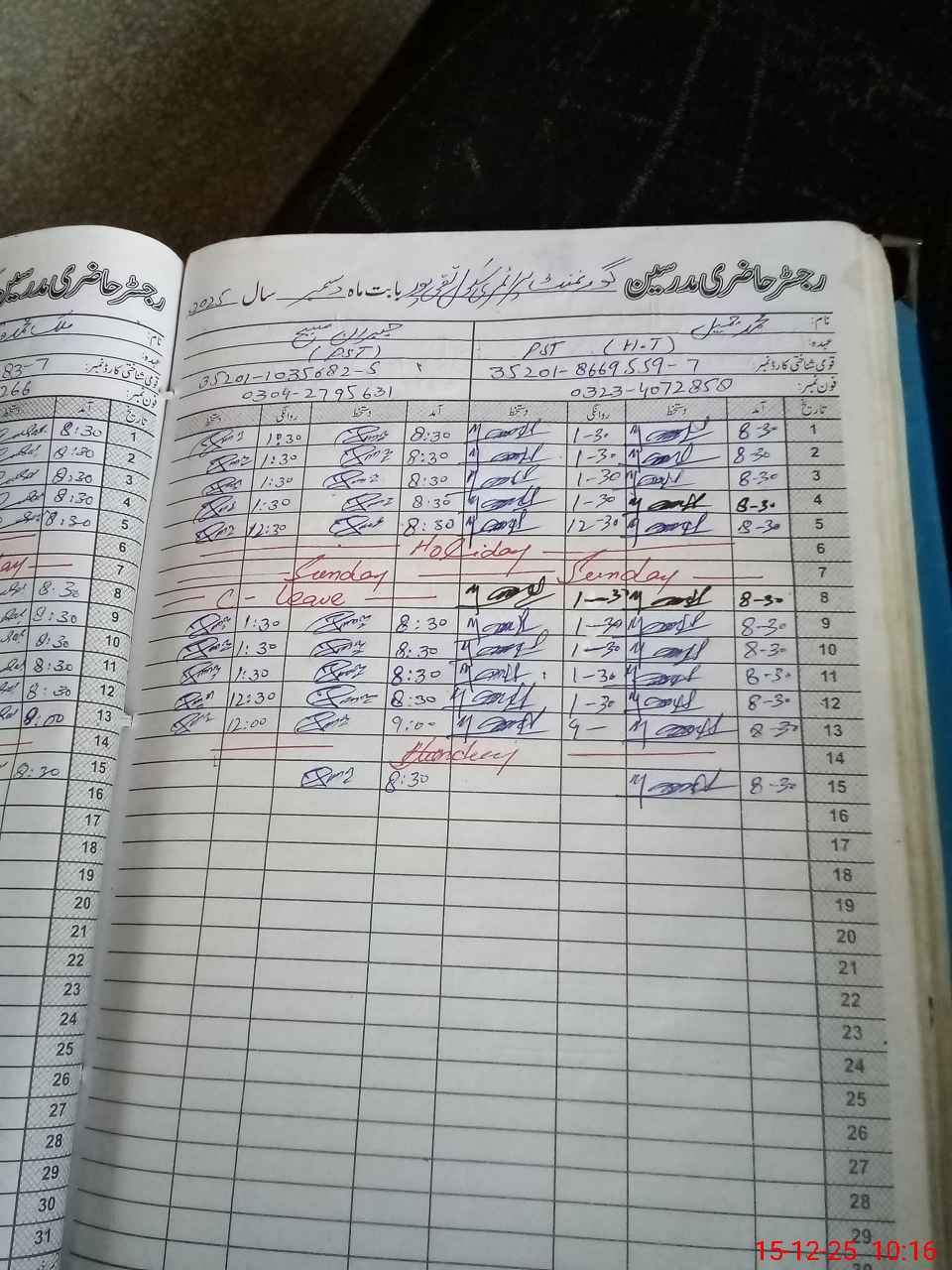 | CNIC | Full Name | Designation | R/C | Absence During Last Calender Month |