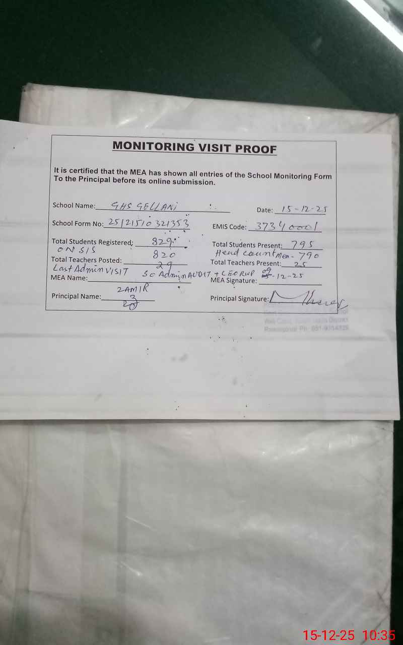 | EMIS Code: 37340001 | Name of School: GHS GELLANI MODEL WAH CANTT | |||