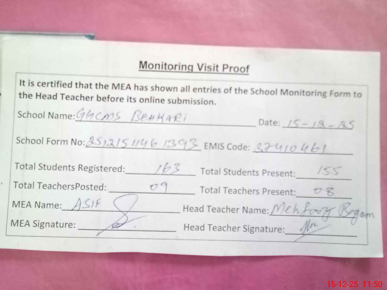 | EMIS Code: 37410461 | Name of School: GGCMS BEHKARI | |||