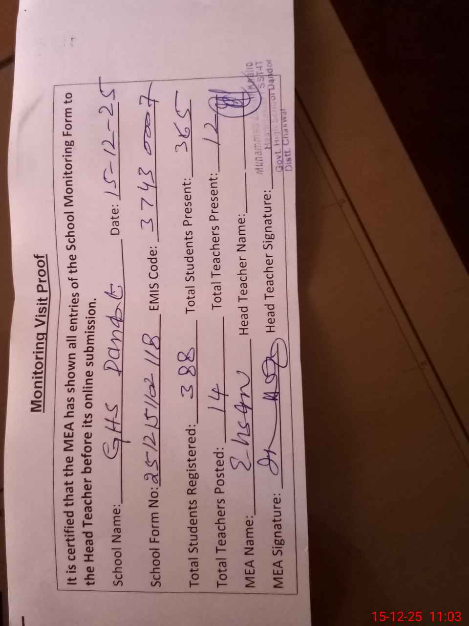 | EMIS Code: 37430007 | Name of School: GHS DANDOOT | |||