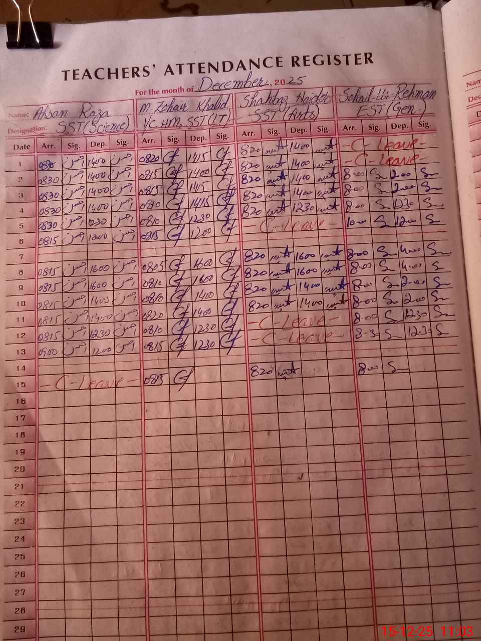 | CNIC | Full Name | Designation | R/C | Absence During Last Calender Month |