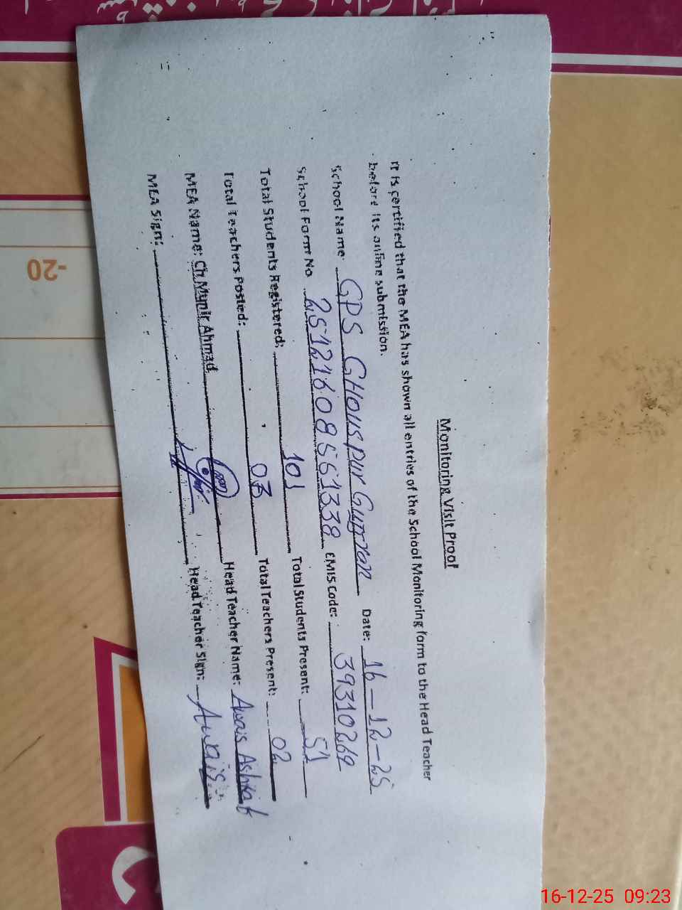 | Attendance Register | Head Teacher | MEA with School | Visit Proof |