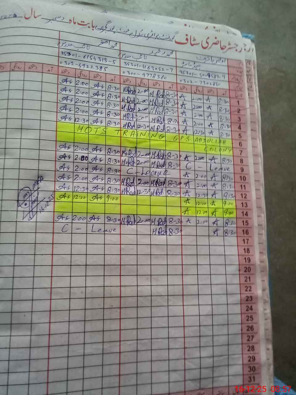 | CNIC | Full Name | Designation | R/C | Absence During Last Calender Month |