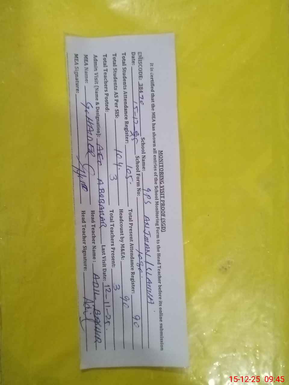 | Attendance Register | Head Teacher | MEA with School | Visit Proof |