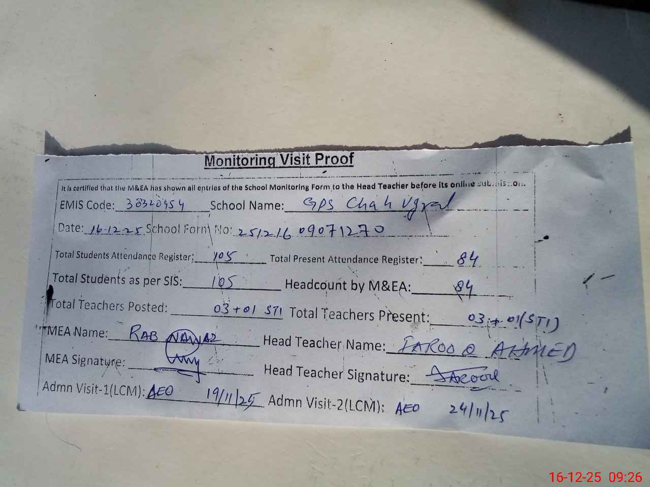 | EMIS Code: 38320454 | Name of School: GPS CHAH UGRAL | |||