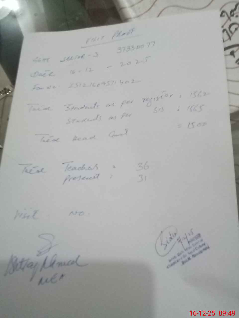 | Remarks (Use Separate Page if Required): Total teachers 36 present teachers are 31 under mentioned teacher is absent from 17.08.2024 till date 1 munazza Fatma est cscnic no 3830257726942 students as per register 2562 students as per sis1565 | |||||