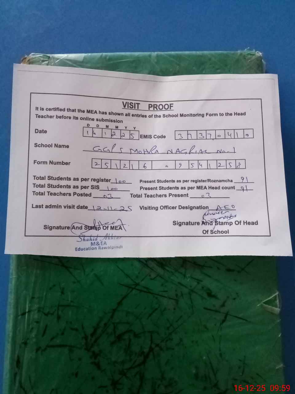 | Attendance Register | Head Teacher | MEA with School | Visit Proof |