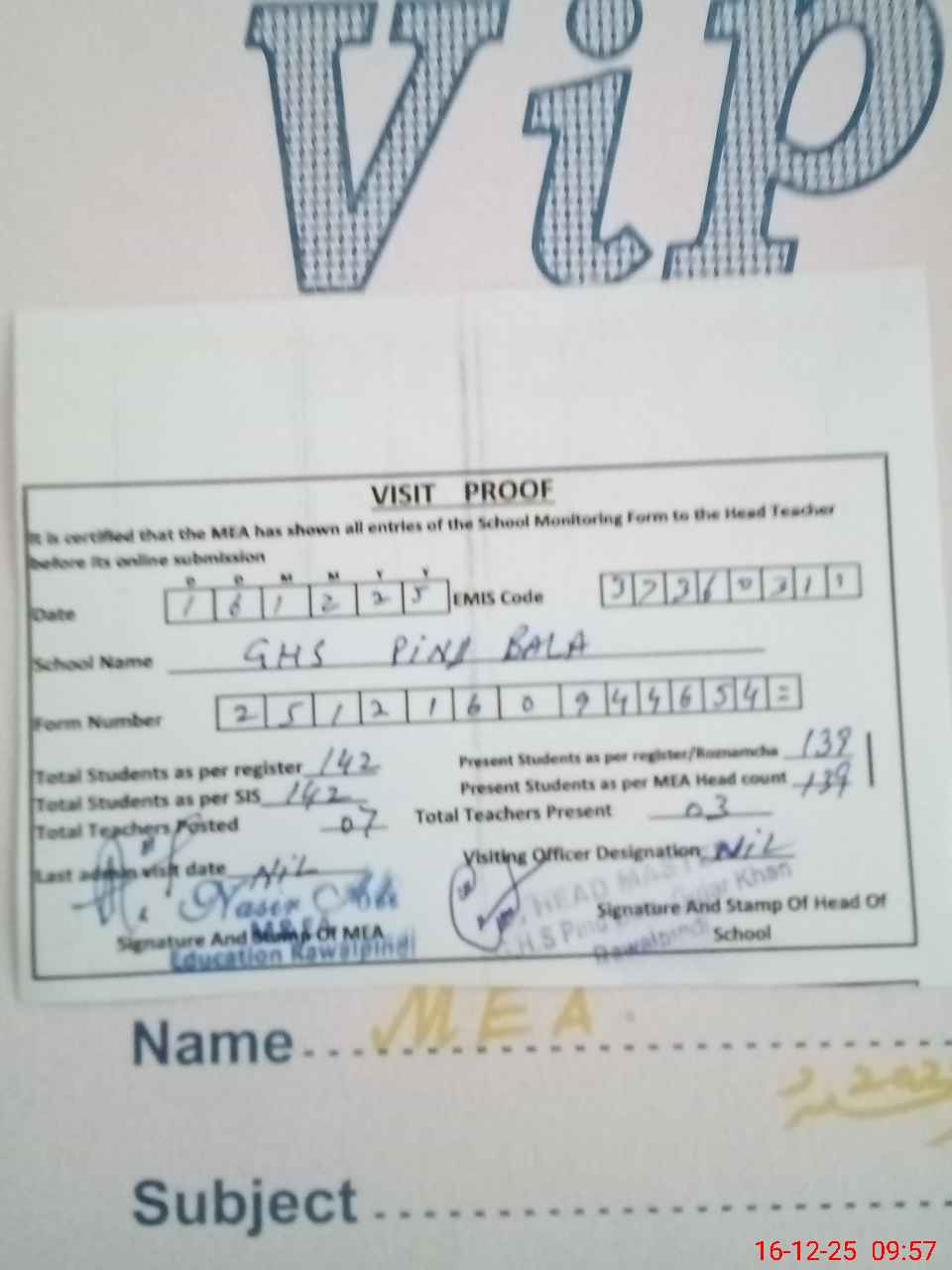 | Attendance Register | Head Teacher | MEA with School | Visit Proof |