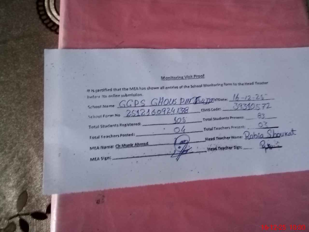 | Attendance Register | Head Teacher | MEA with School | Visit Proof |