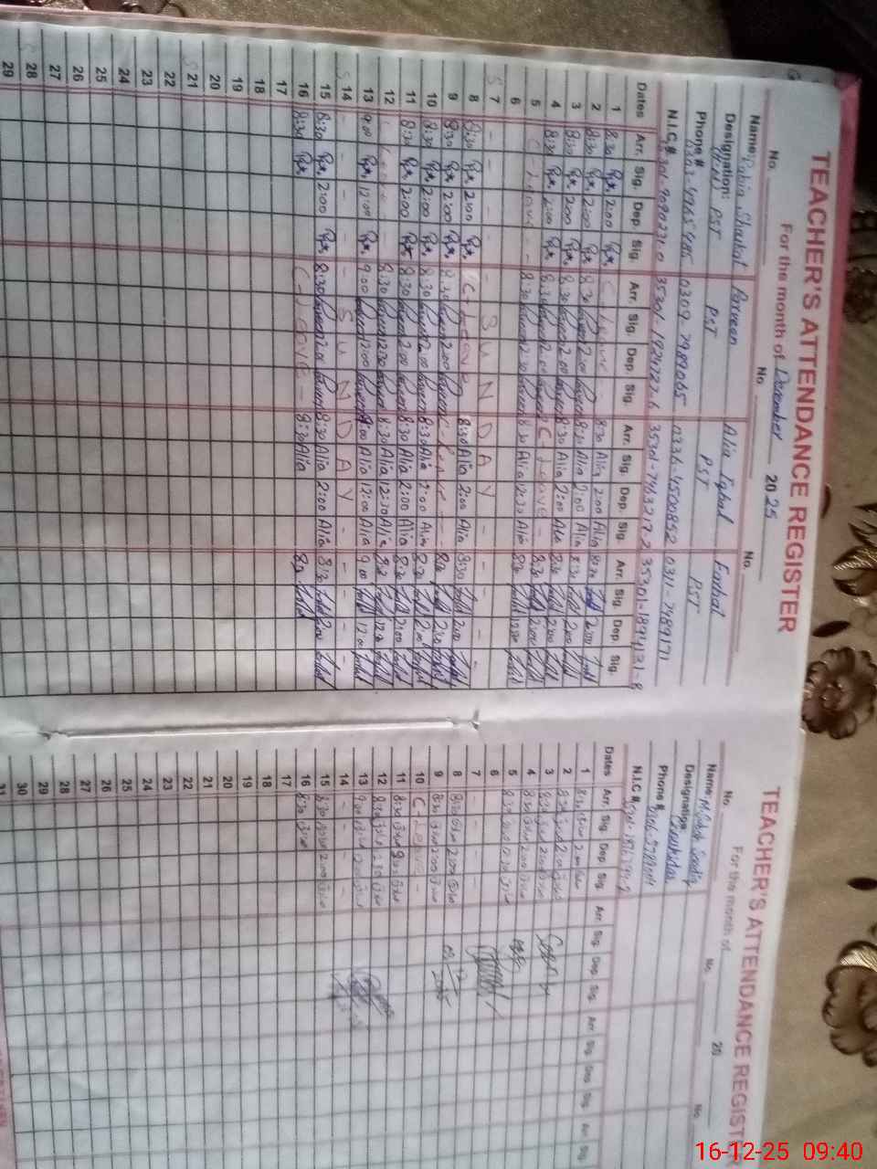 | CNIC | Full Name | Designation | R/C | Absence During Last Calender Month |