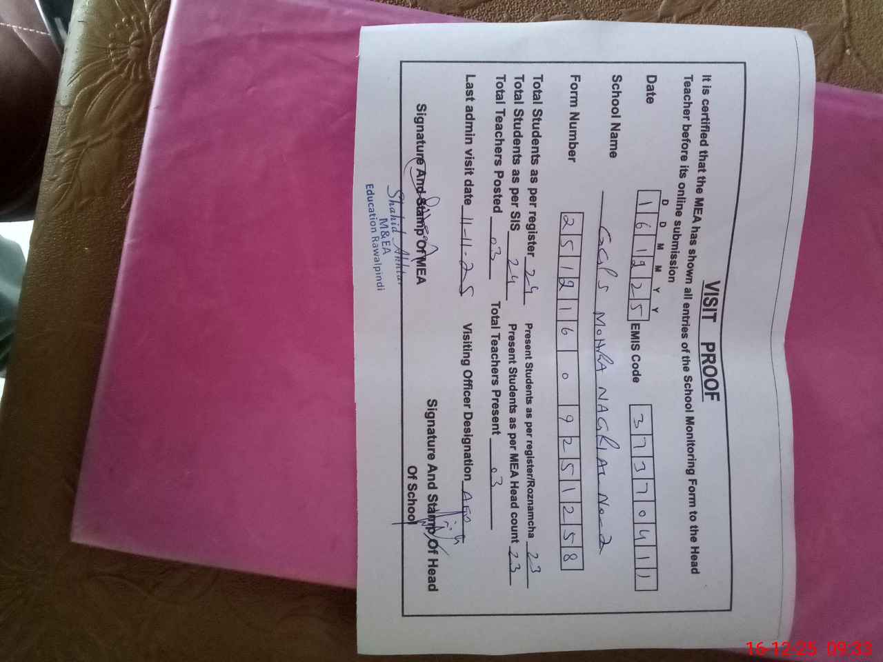 | Certified that this School was Inspected by the Undersigned MEA/DMO Today and the Information Stated Above is as Per Record. | |||||