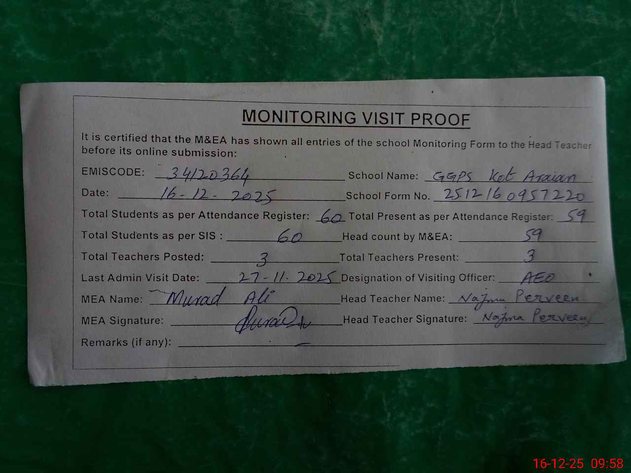 | Attendance Register | Head Teacher | MEA with School | Visit Proof |