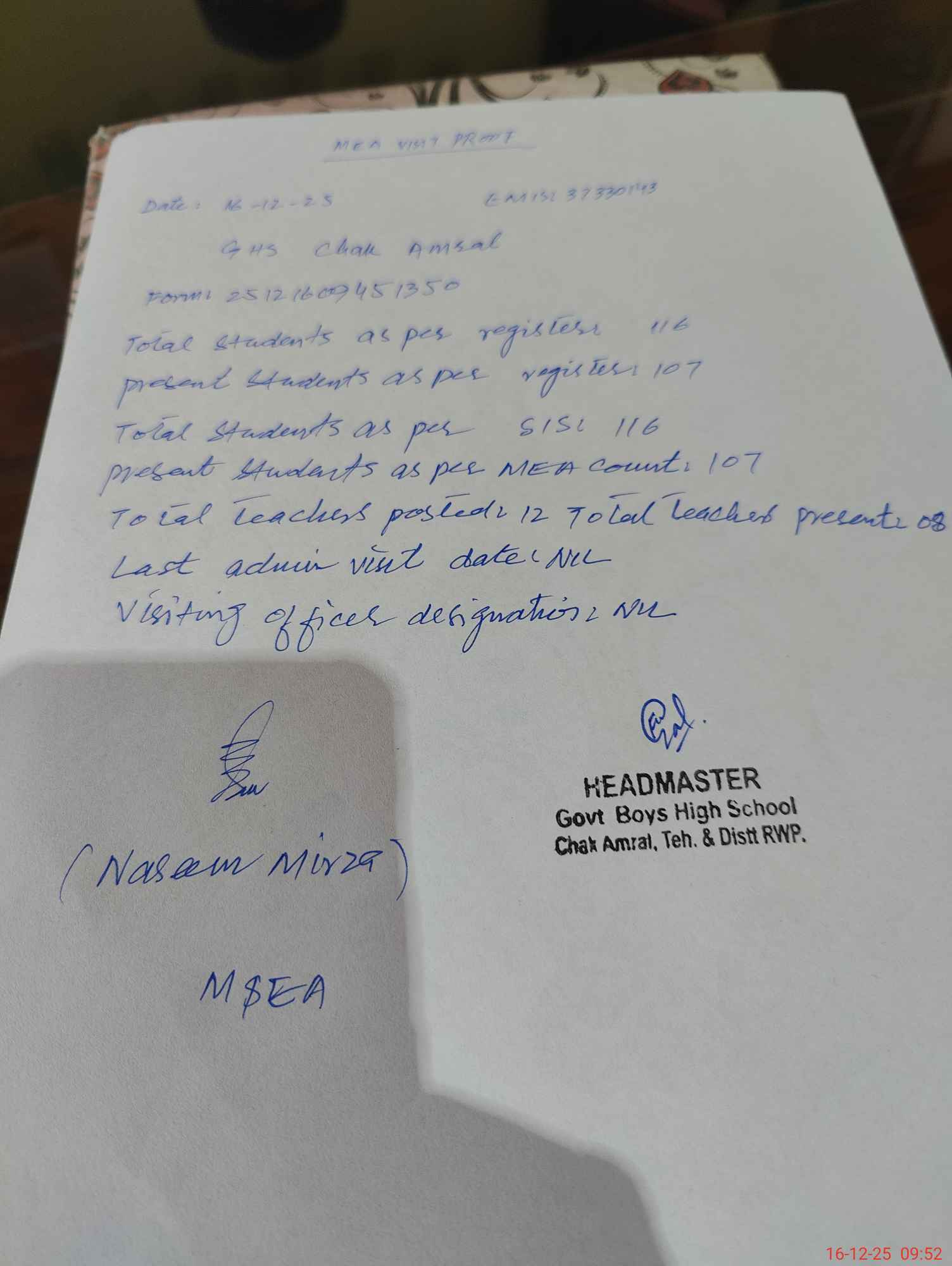 | Certified that this School was Inspected by the Undersigned MEA/DMO Today and the Information Stated Above is as Per Record. | |||||