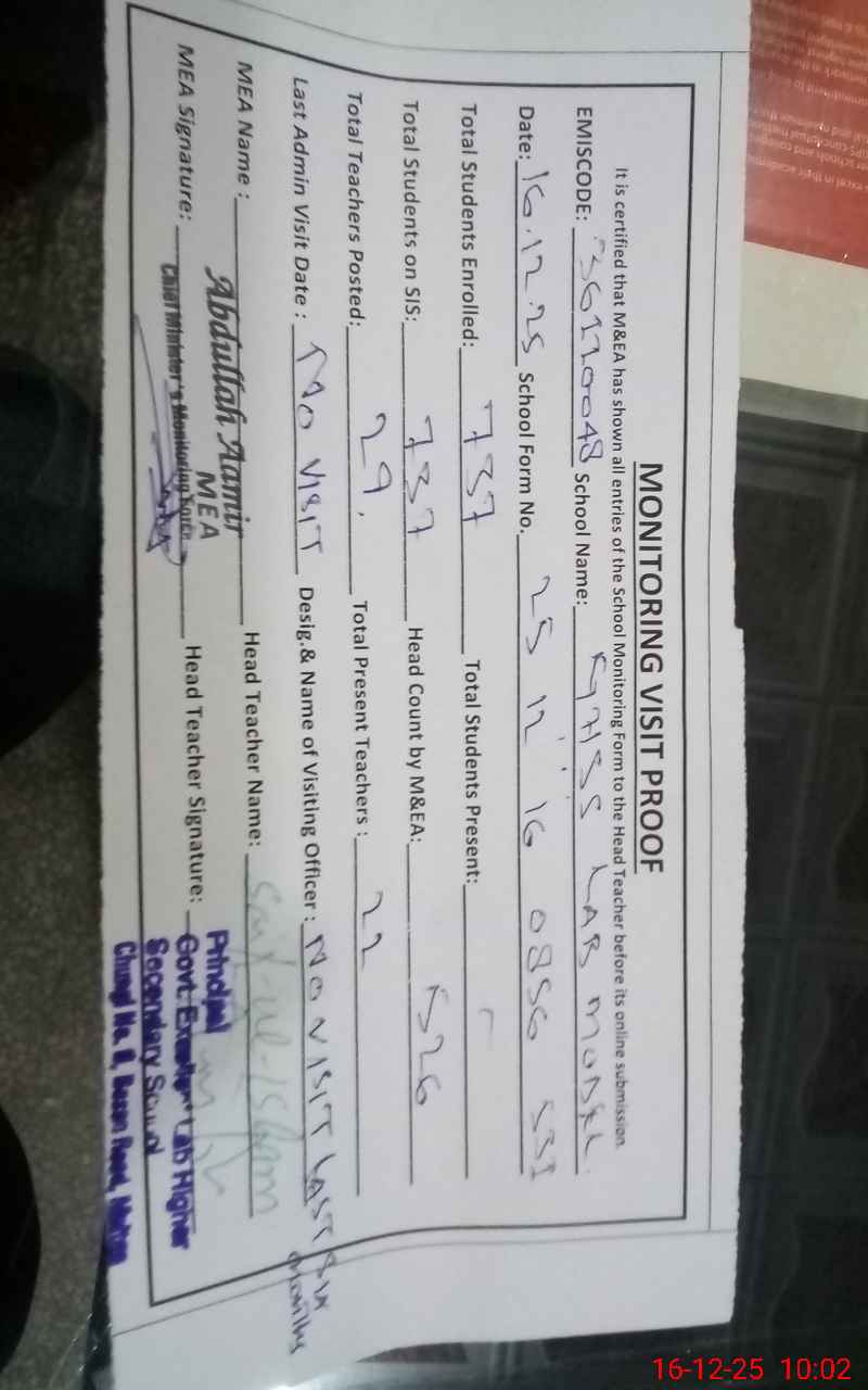 | EMIS Code: 36110048 | Name of School: GHSS LAB. MODEL CHUNGI NO.6 MULTAN | |||