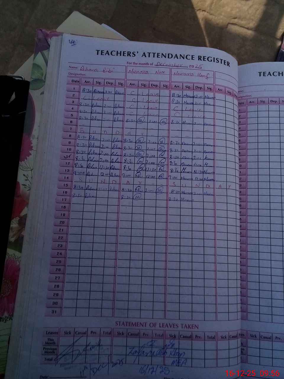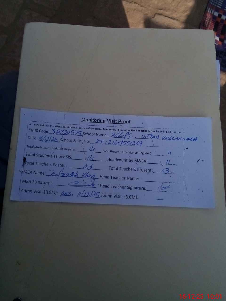 | Attendance Register | Head Teacher | MEA with School | Visit Proof |