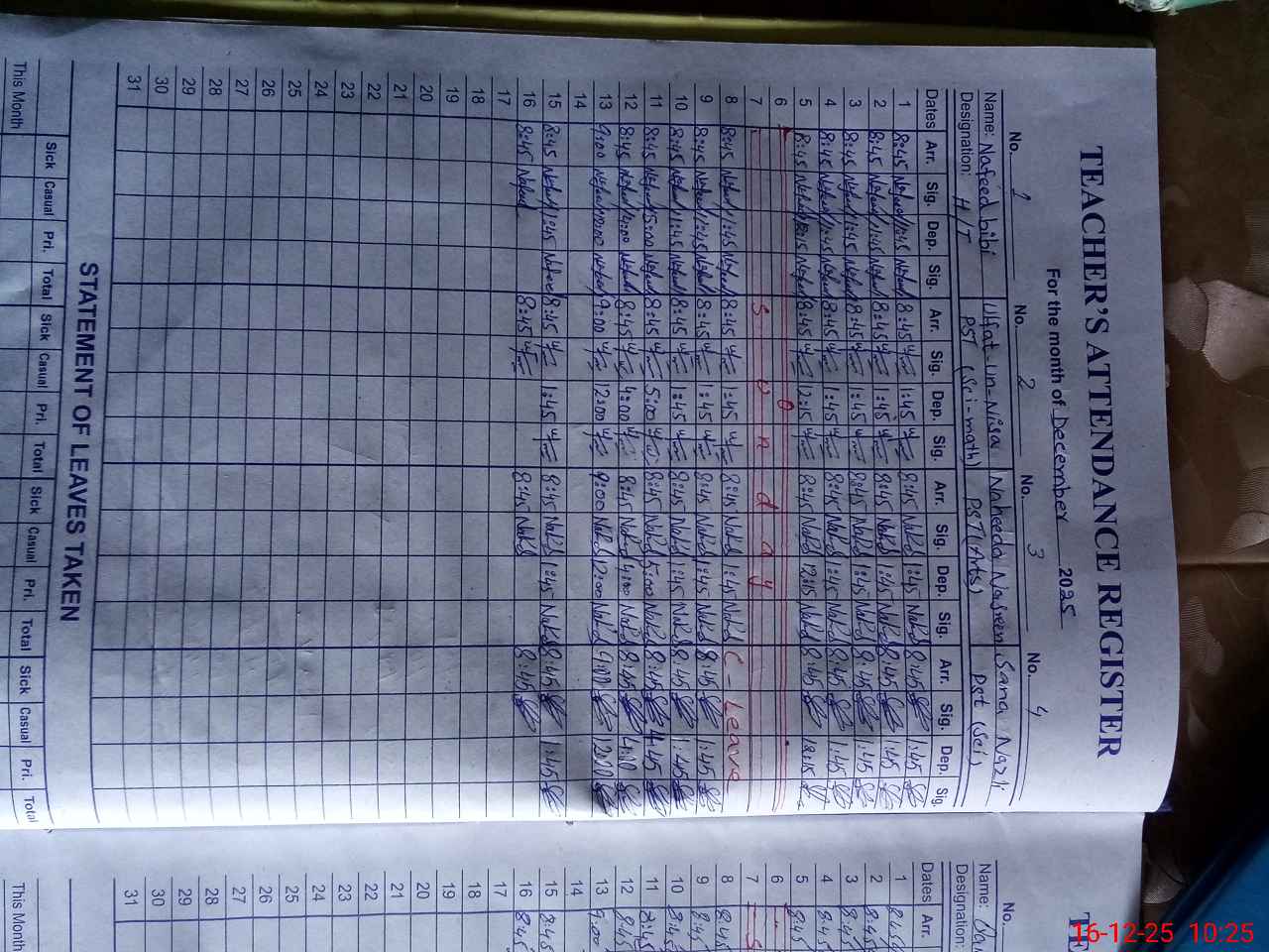 | CNIC | Full Name | Designation | R/C | Absence During Last Calender Month |