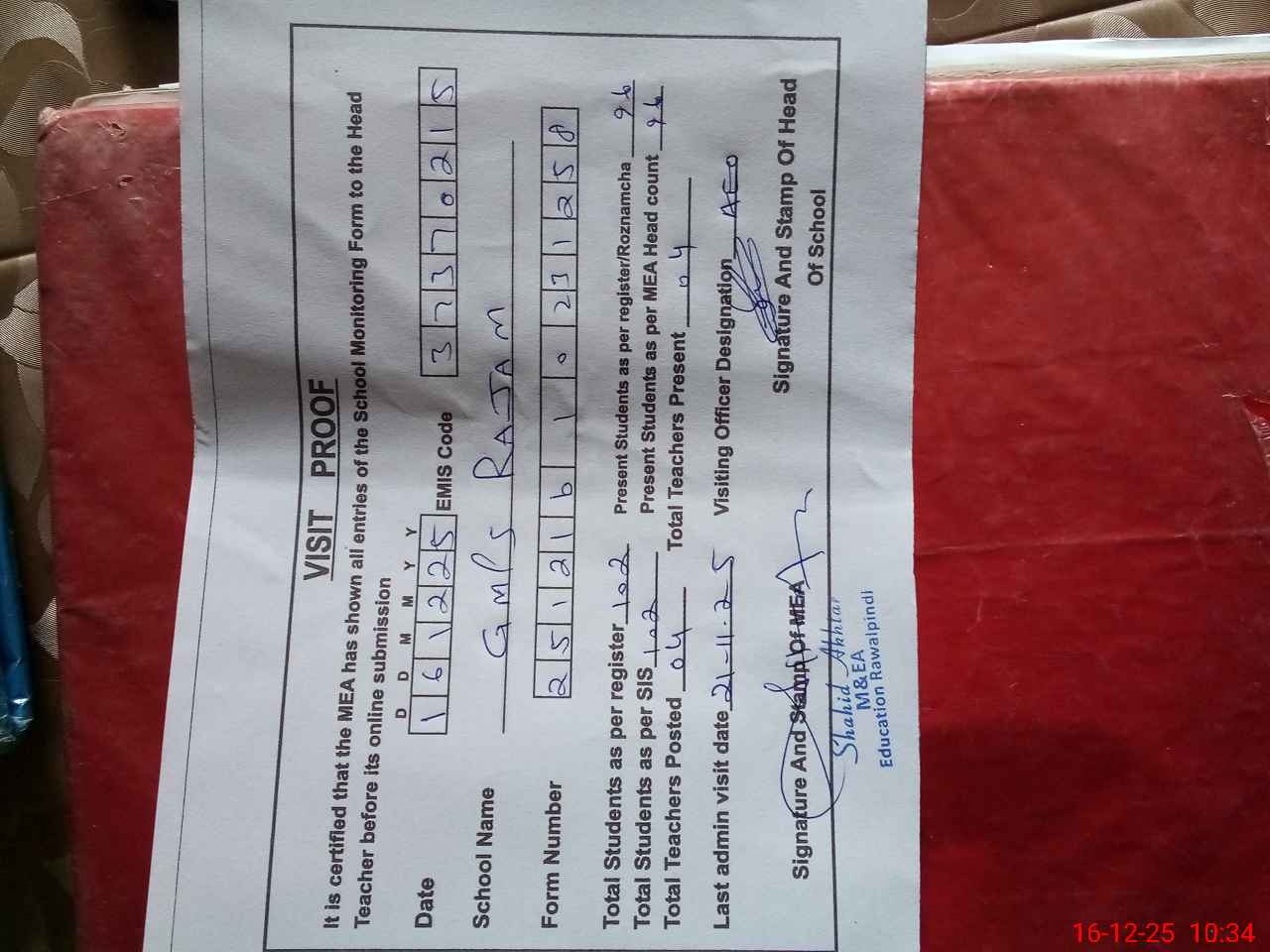 | Attendance Register | Head Teacher | MEA with School | Visit Proof |