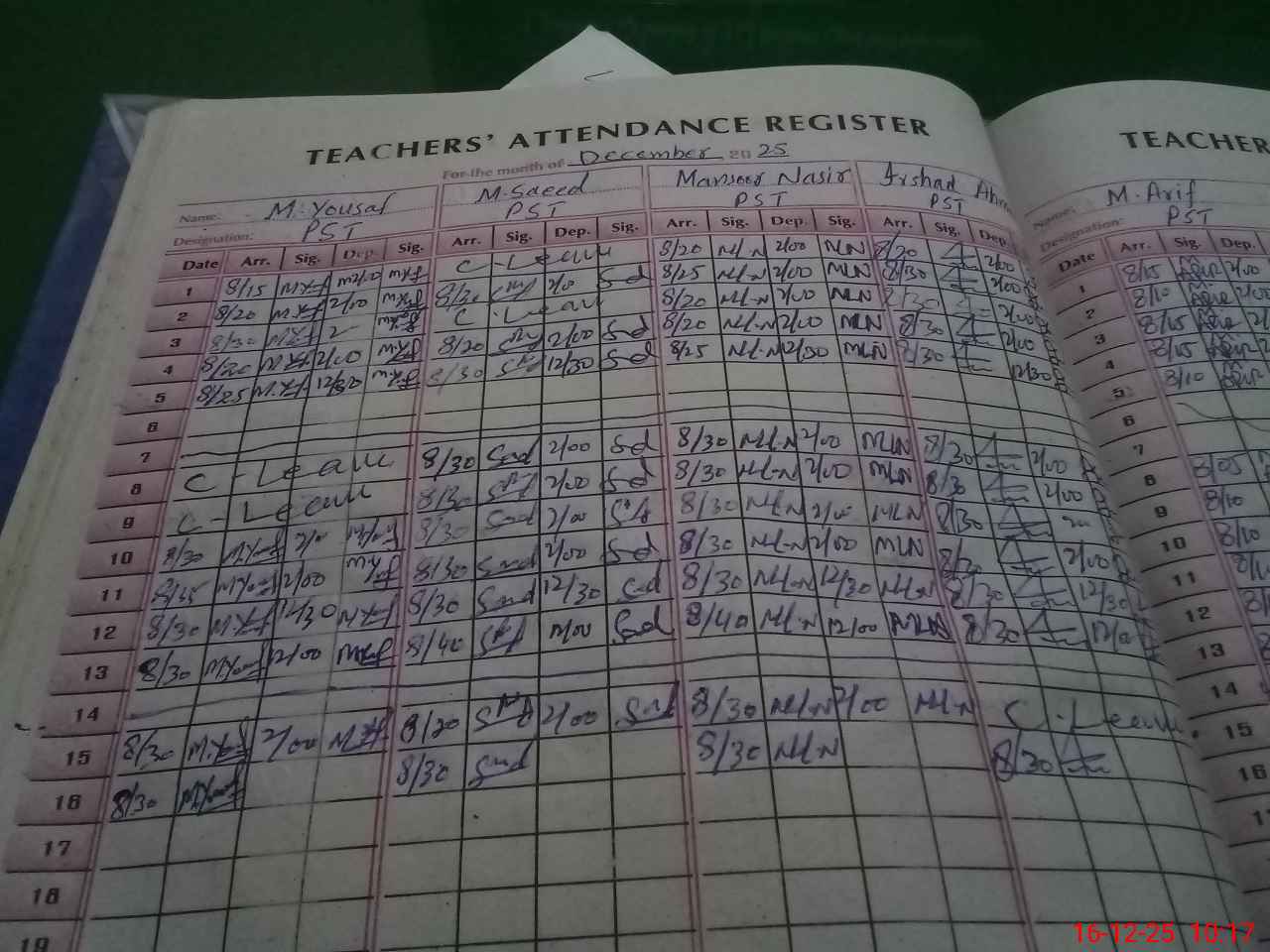 | CNIC | Full Name | Designation | R/C | Absence During Last Calender Month |