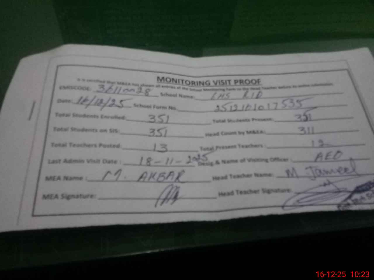 | Attendance Register | Head Teacher | MEA with School | Visit Proof |