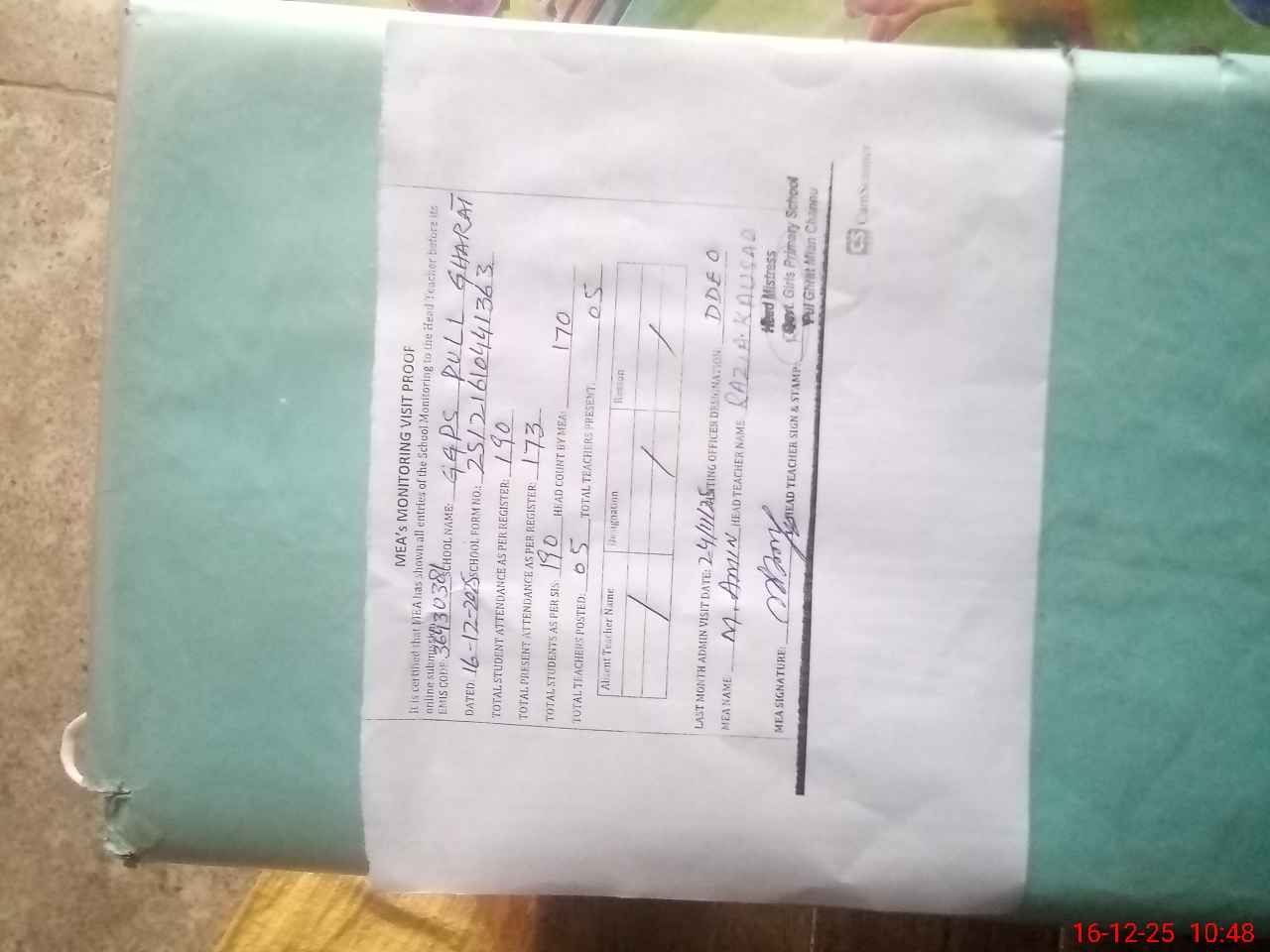 | Attendance Register | Head Teacher | MEA with School | Visit Proof |
