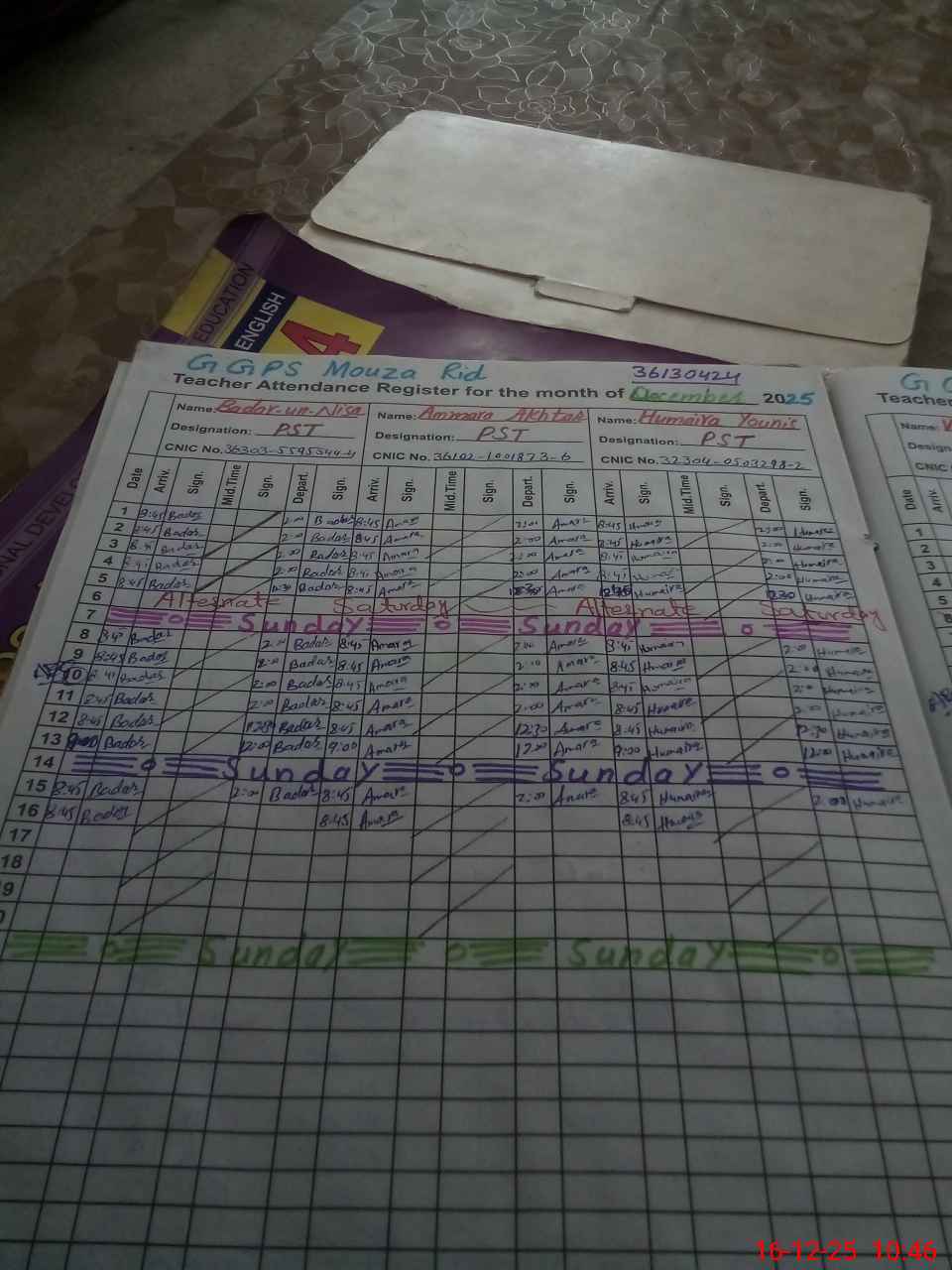 | CNIC | Full Name | Designation | R/C | Absence during last cal. month |