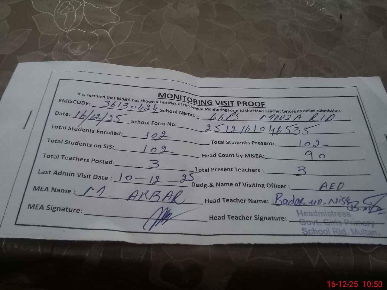 | Attendance Register | Head Teacher | MEA with School | Visit Proof |
