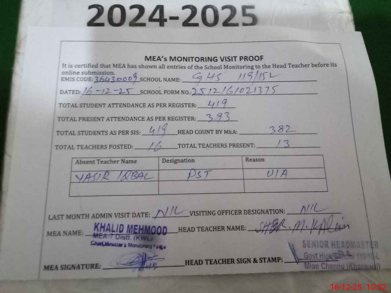 | EMIS Code: 36430009 | Name of School: GHS 119/15-L, MIAN CHANNU | |||
