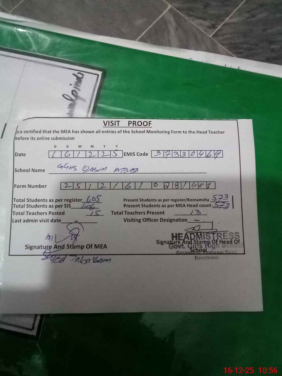 | Attendance Register | Head Teacher | MEA with School | Visit Proof |