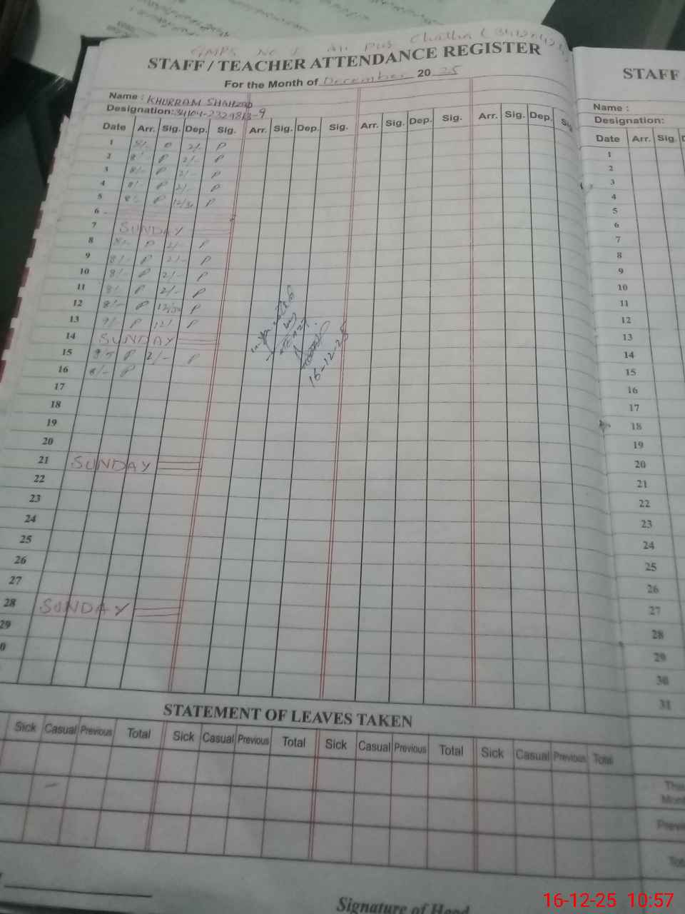 | CNIC | Full Name | Designation | R/C | Absence During Last Calender Month |
