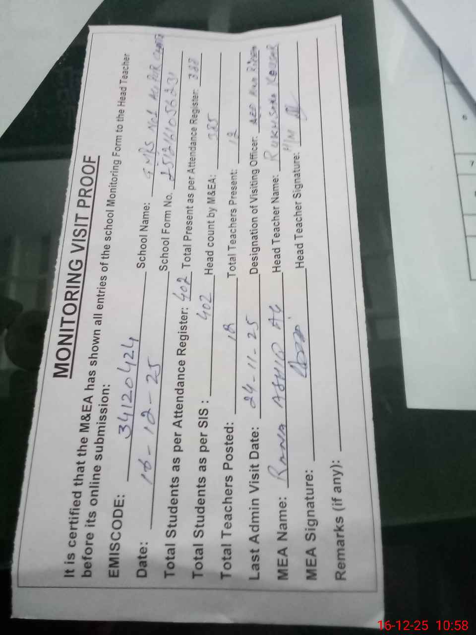 | Attendance Register | Head Teacher | MEA with School | Visit Proof |