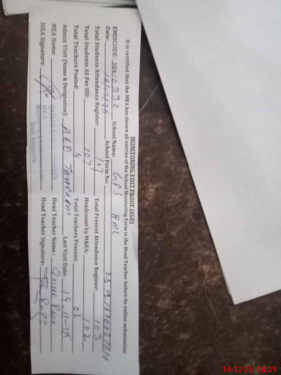| Attendance Register | Head Teacher | MEA with School | Visit Proof |