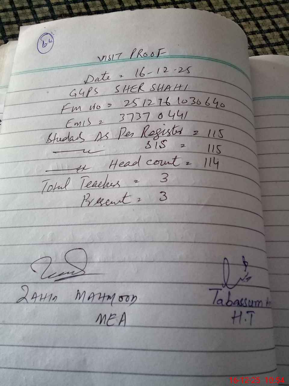 | Attendance Register | Head Teacher | MEA with School | Visit Proof |