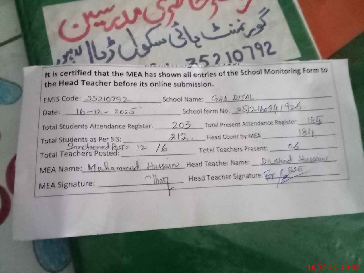 | Remarks (Use Separate Page if Required): 1 No visit of any adminstrative since long time 2 Residence of private person with her family in school 3 NSB data not up dated on SIS since long time 4 BOYS high school and fe male students sitting in middle sections also 5 Eight toilets locked not in used . Building constructed for high class 6 DILSHAD Hussain SSE head master on additional duty vide order no 2598 date 31-5 2025 charge of AEO jallo more but from 1st December 2025 to date of visit he is not coming in school a single day | |||||