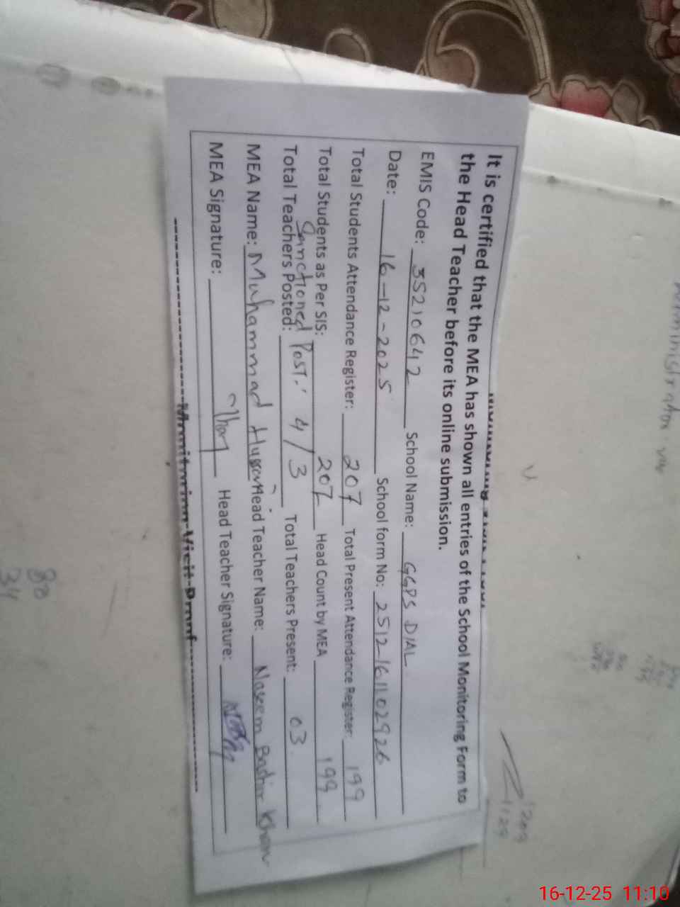 | Certified that this School was Inspected by the Undersigned MEA/DMO Today and the Information Stated Above is as Per Record. | |||||