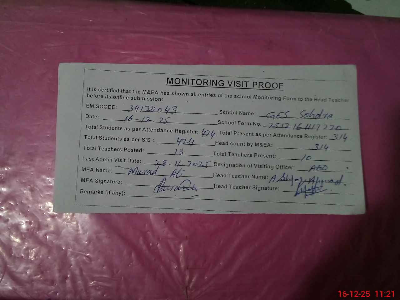 | Attendance Register | Head Teacher | MEA with School | Visit Proof |