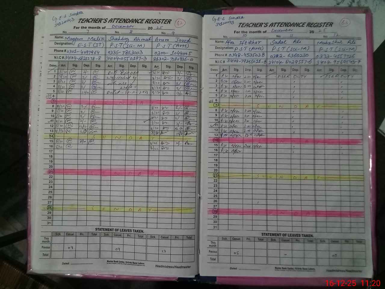 | CNIC | Full Name | Designation | R/C | Absence During Last Calender Month |