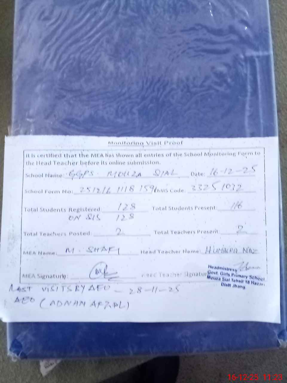 | Attendance Register | Head Teacher | MEA with School | Visit Proof |