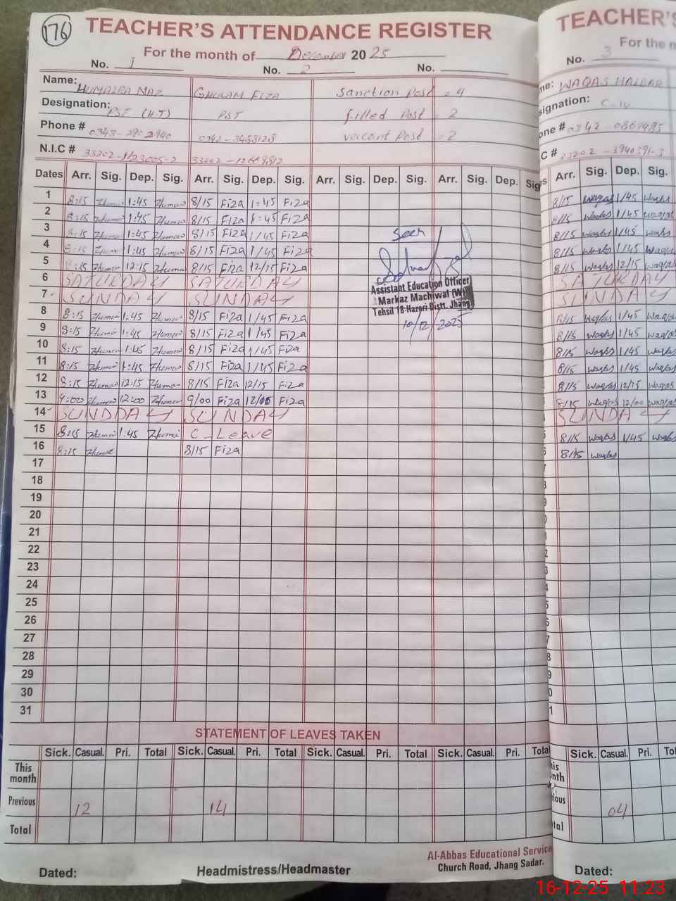 | Name: HU**** NA**** Designation: (School Headmaster's/Headmistress's) PST Phone/Cell Number: 03**** |