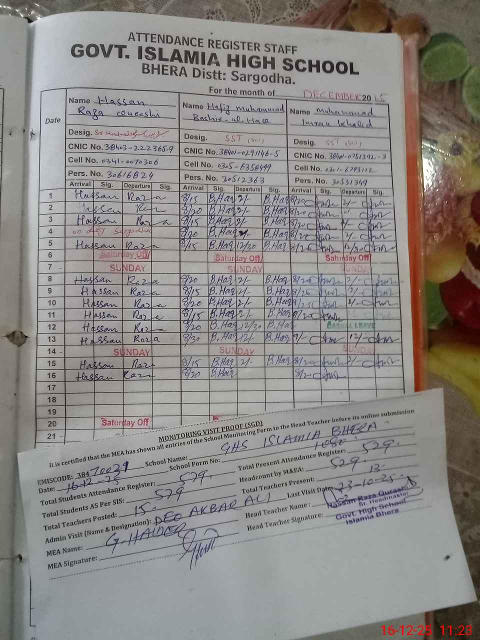 | CNIC | Full Name | Designation | R/C | Absence During Last Calender Month |
