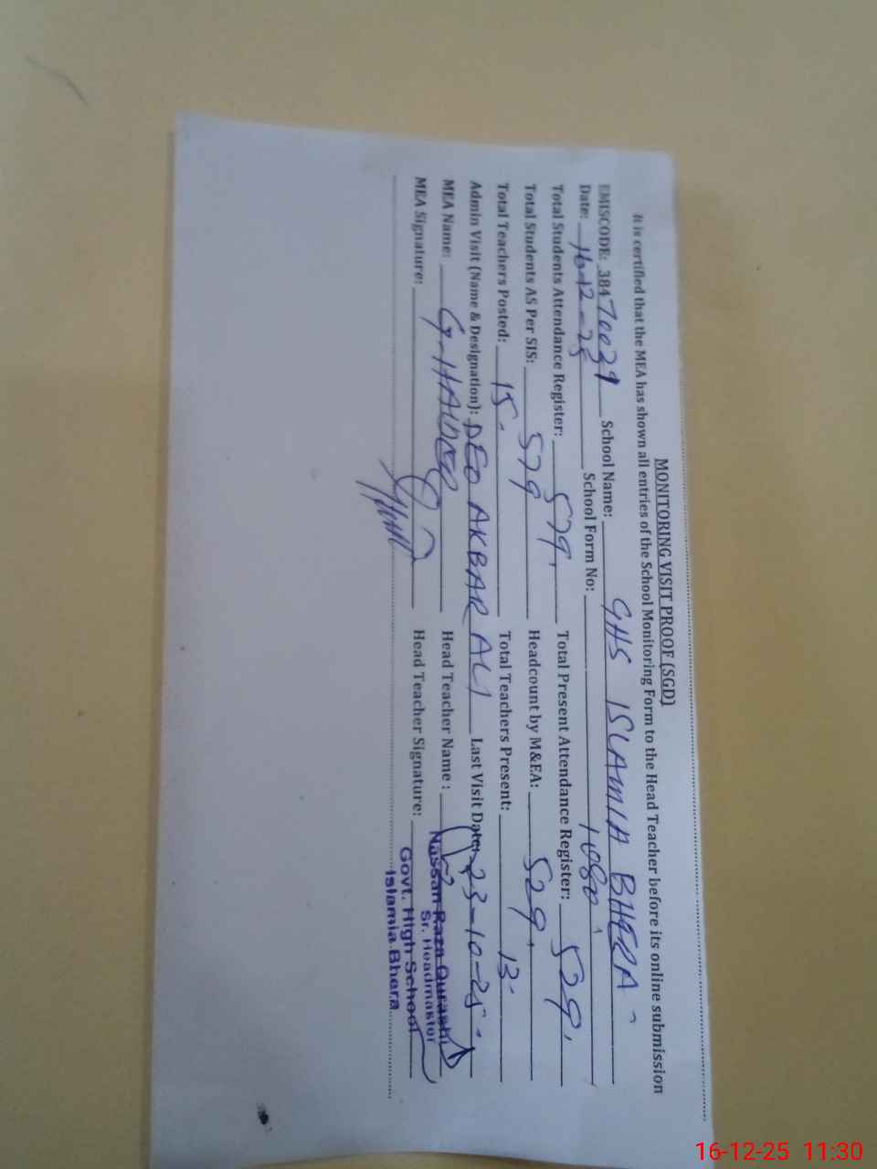 | Attendance Register | Head Teacher | MEA with School | Visit Proof |