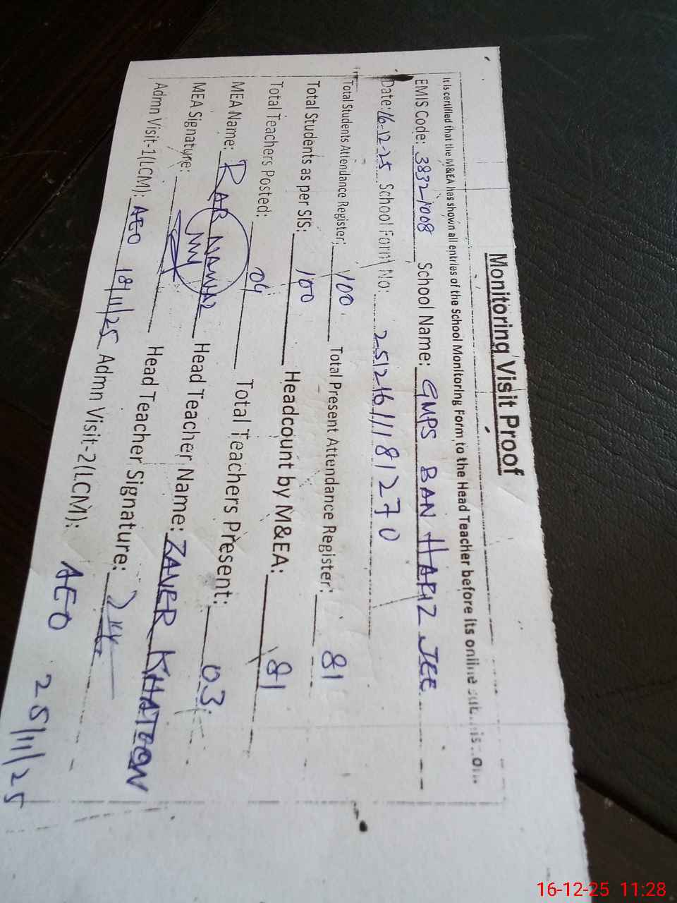 | EMIS Code: 38321008 | Name of School: GMPS BAN HAFIZ JEE CHAKRALA | |||