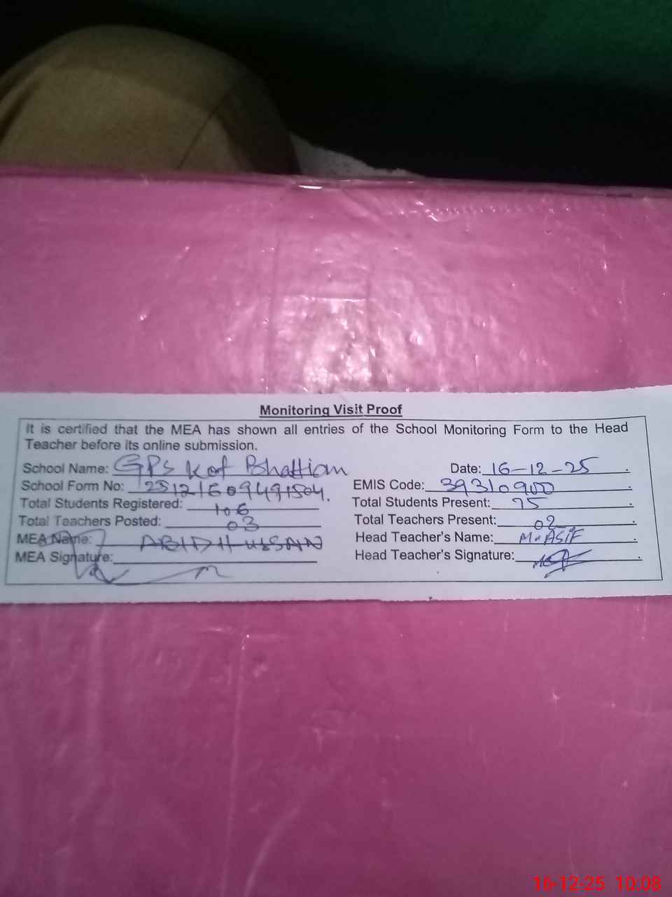 | Certified that this School was Inspected by the Undersigned MEA/DMO Today and the Information Stated Above is as Per Record. | |||||