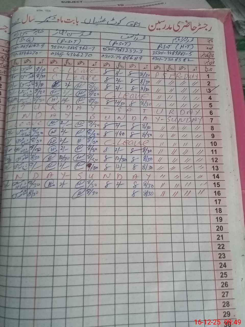 | CNIC | Full Name | Designation | R/C | Absence During Last Calender Month |