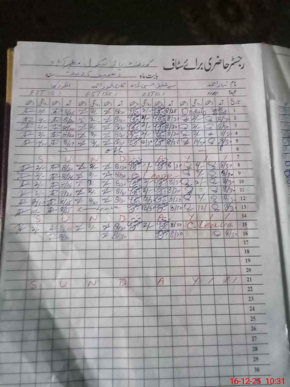 | CNIC | Full Name | Designation | R/C | Absence During Last Calender Month |