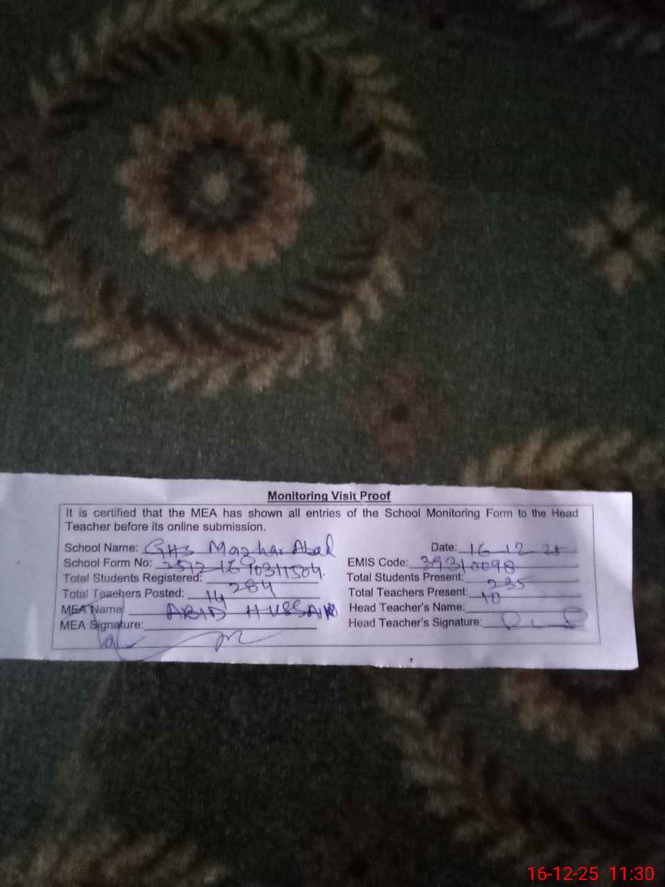 | Attendance Register | Head Teacher | MEA with School | Visit Proof |