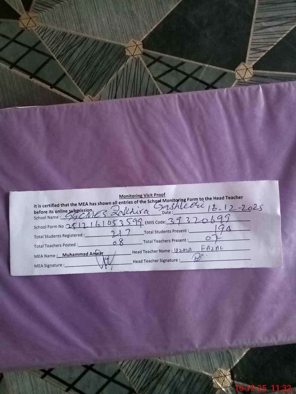 | Attendance Register | Head Teacher | MEA with School | Visit Proof |
