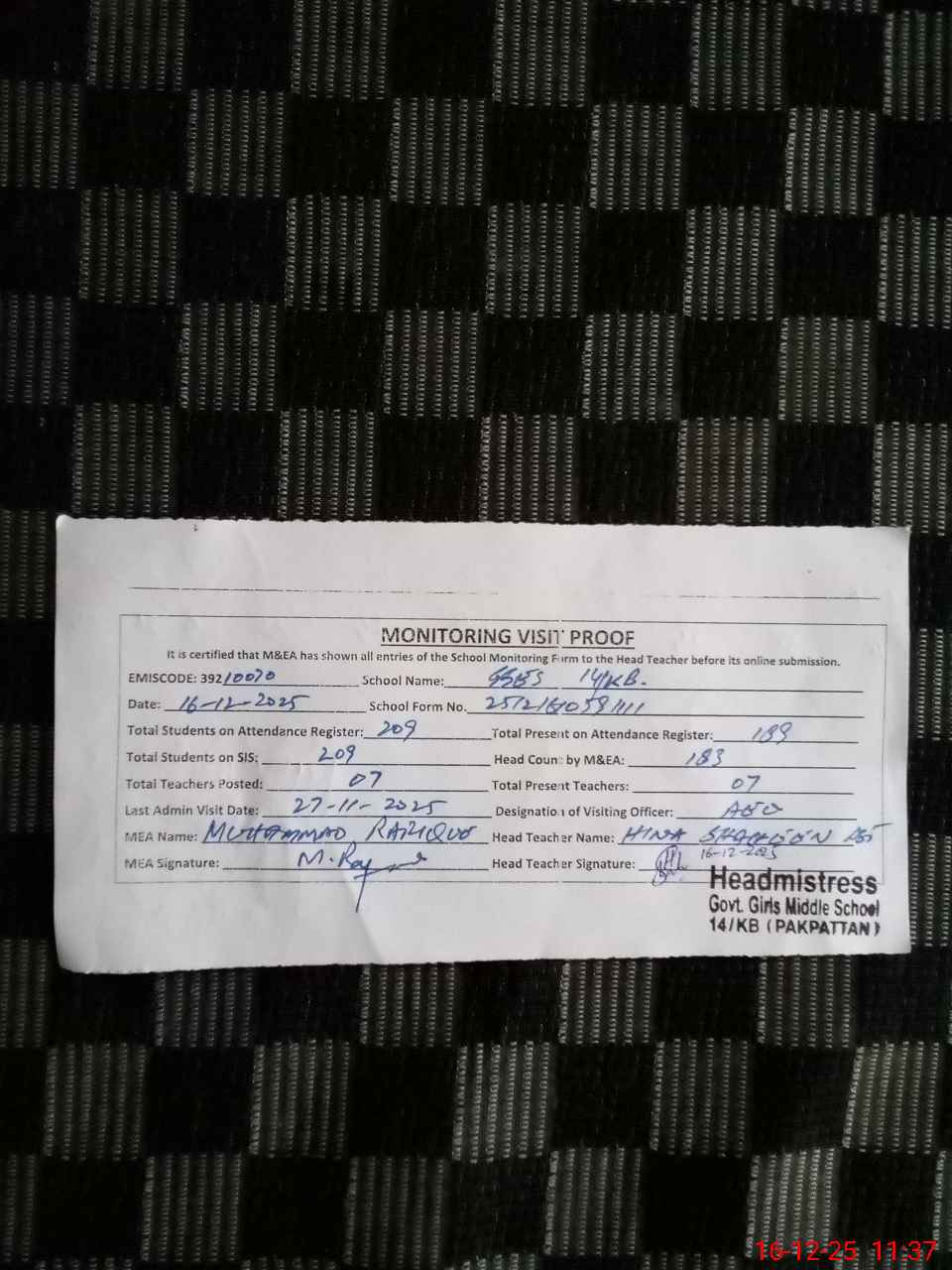 | Certified that this School was Inspected by the Undersigned MEA/DMO Today and the Information Stated Above is as Per Record. | |||||
