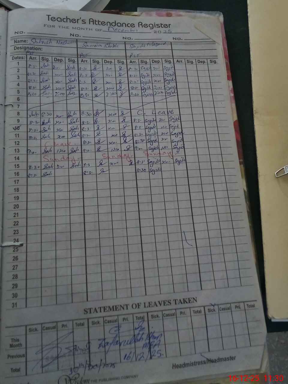 | CNIC | Full Name | Designation | R/C | Absence During Last Calender Month |