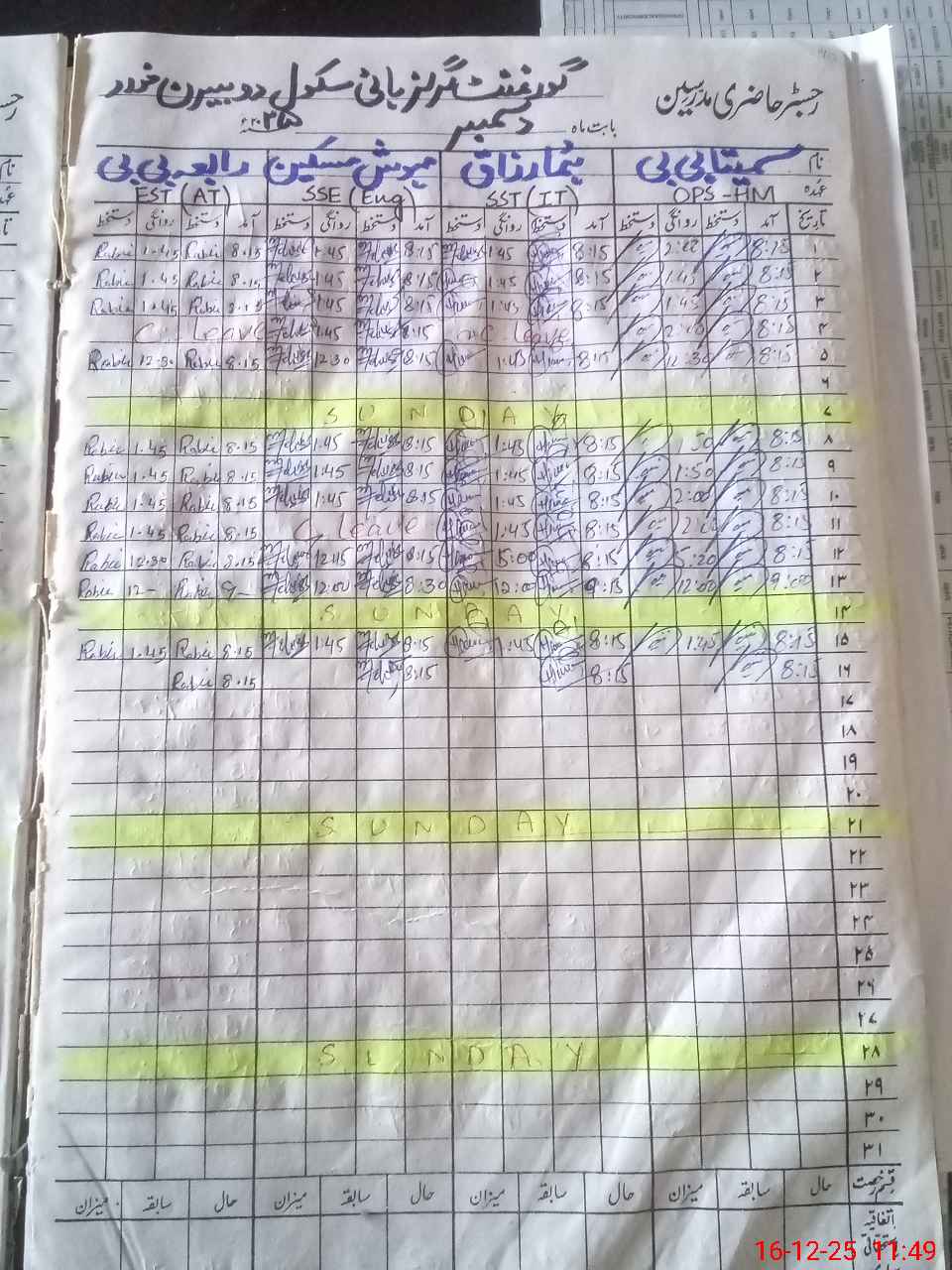 | CNIC | Full Name | Designation | R/C | Absence During Last Calender Month |