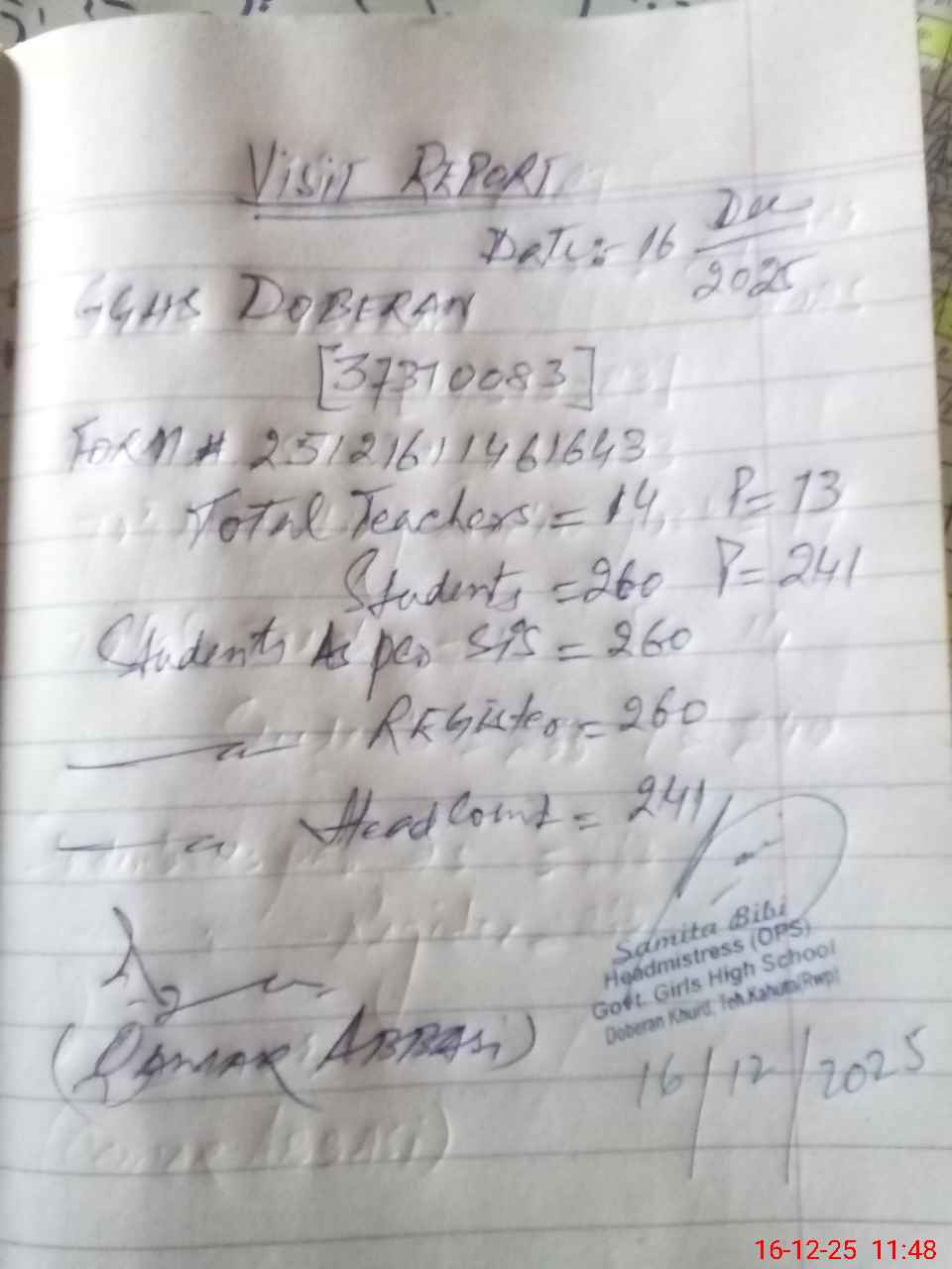 | EMIS Code: 37310083 | Name of School: GGHS DOBERAN KHURD | |||
